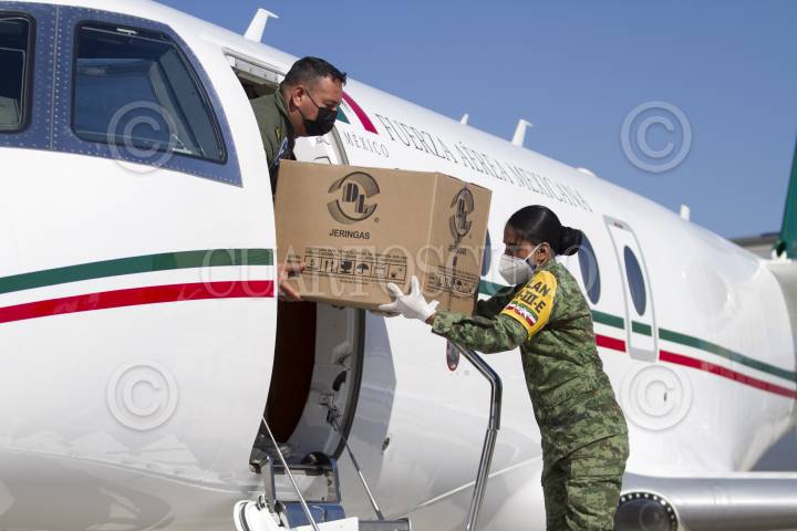 APODACA, NUEVO LEÓN, 28DICIEMBRE2020.- Las primeras mil 950 vacunas destinadas para el personal médico de Nuevo León, arribaron a la Fuerza Aérea Militar, las cuales fueron recibidas por el secretario de salud del estado, Manuel de la O Cavazos, posteriormente fueron trasladadas al Hospital Militar dentro de las instalaciones de la IV Región Militar. FOTO: GABRIELA PÉREZ MONTIEL / CUARTOSCURO.COM