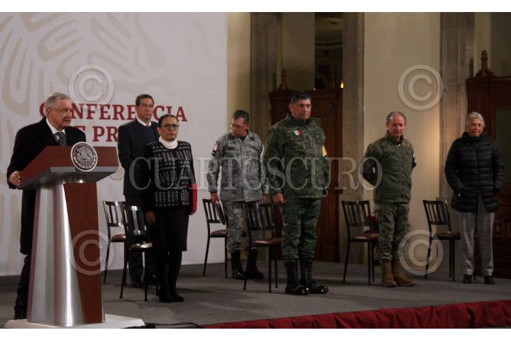 CIUDAD DE MÉXICO, 31DICIEMBRE2020.- Andrés Manuel López Obrador, presidente de México acompañado de Rosa Icela Rodríguez Velázquez, secretaria de Seguridad Pública de la Secretaría de Seguridad y Protección Ciudadana (SSPC); Luis Cresencio Sandoval González, secretario de la Defensa Nacional; José Rafael Ojeda Durán, secretario de Marina; Olga Sánchez Cordero, secretaria de Gobernación; Ricardo Mejía Berdeja, subsecretario de Seguridad Pública de la Secretaría de Seguridad y Protección Ciudadana (SSPC) y Luis Rodríguez Bucio, titular de la Guardia Nacional, durante la conferencia de prensa en Palacio Nacional que se dedicó al tema de seguridad. FOTO: ANDREA MURCIA /CUARTOSCURO.COM