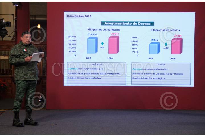 CIUDAD DE MÉXICO, 31DICIEMBRE2020.- Andrés Manuel López Obrador, presidente de México acompañado de Rosa Icela Rodríguez Velázquez, secretaria de Seguridad Pública de la Secretaría de Seguridad y Protección Ciudadana (SSPC); Luis Cresencio Sandoval González, secretario de la Defensa Nacional; José Rafael Ojeda Durán, secretario de Marina; Olga Sánchez Cordero, secretaria de Gobernación; Ricardo Mejía Berdeja, subsecretario de Seguridad Pública de la Secretaría de Seguridad y Protección Ciudadana (SSPC) y Luis Rodríguez Bucio, titular de la Guardia Nacional, durante la conferencia de prensa en Palacio Nacional que se dedicó al tema de seguridad. FOTO: ANDREA MURCIA /CUARTOSCURO.COM