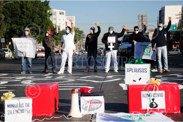 CIUDAD DE MÉXICO, 01ENERO2021.- Personal médico que labora en el Hospital La Raza se manifestó afuera de este nosocomio para exigir ser vacunados contra el Covid-19 y no sea a base de influyentismo por parte de los directivos de los hospitales para ser inyectados, además, solicitaron se les brinde equipo de seguridad suficiente para evitar contagiarse por coronavirus dentro de la unidad médica. Los manifestantes bloquearon por más de media hora un tramo de Circuito Interior. FOTO: DANIEL AUGUSTO /CUARTOSCURO.COM