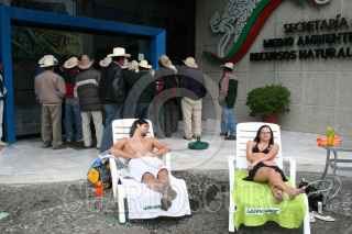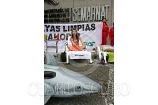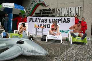 MÈXICO, D.F. 29JUNIO2006.- En la sede de la SEMARNAT manifestantes de Greenpeace se manifestaron para exigir a las autoridades ambientales se den a conocer los riesgos sanitarios en playas como Rosarito, Ciudad del Carmen y Puerto Vallarta ante el pròximo periodo vacacional. FOTO: Paola Hidalgo/CUARTOSCURO.COM
