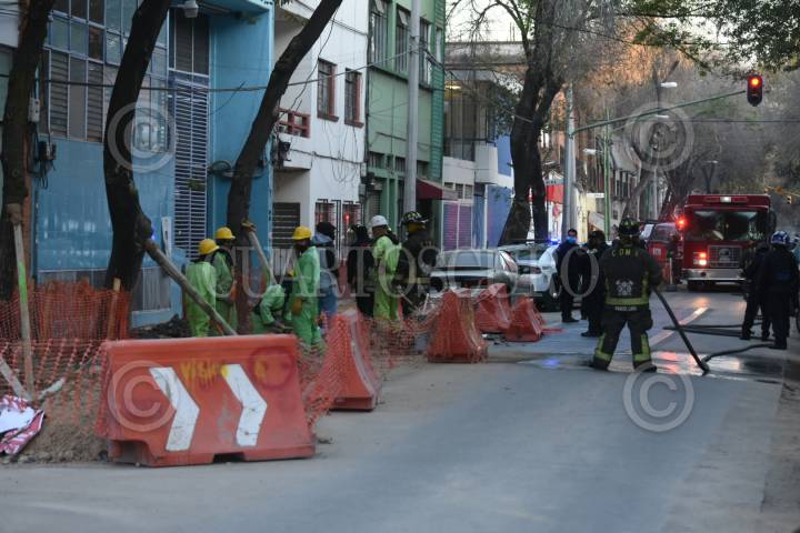 CIUDAD DE MÉXICO, 04ENERO2021.- Trabajadores que se encontraban realizando una zanja para meter cableado eléctrico, en el cruce de Zarco y Mina, en la colonia Guerrero, sin querer picaron una tubería de gas natural lo que provocó la movilización de equipos de emergencia. FOTO: CRISTIAN HERNÁNDEZ/CUARTOSCURO.COM