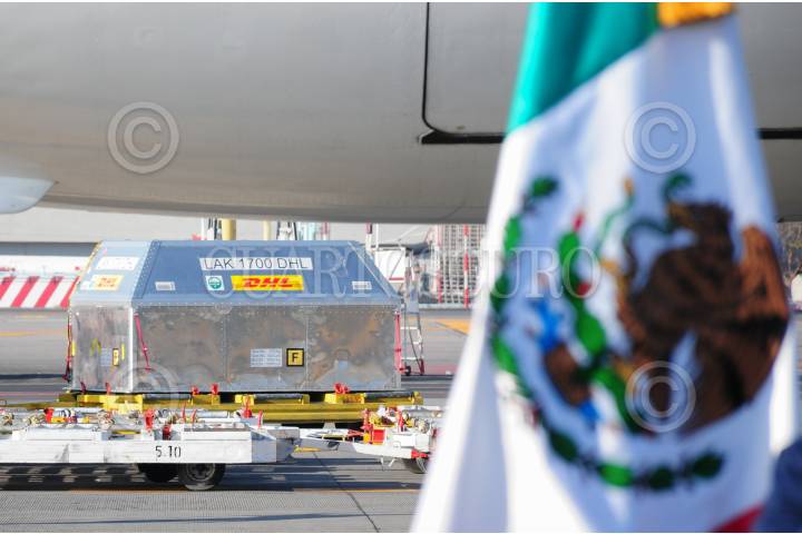CIUDAD DE MÉXICO, 05ENERO2021.- Un nuevo cargamento de la vacuna de Pfizer-BionThech contra el Covid-19 llegó a la Ciudad de México mediante la empresa de paquetería DHL, un total de 53 mil 525 dosis aterrizaron esta mañana en el Aeropuerto Internacional de la Ciudad de México. FOTO: DANIEL AUGUSTO /CUARTOSCURO.COM