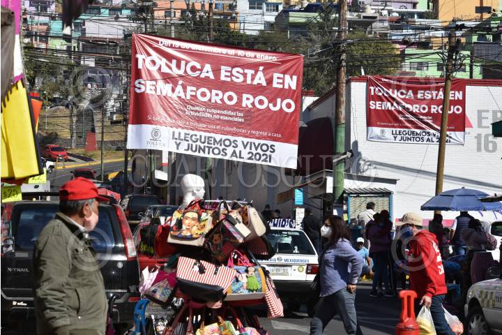 TOLUCA, ESTADO DE MÉXICO, 05ENERO2021.- En el Estado de México continúa el Semáforo Rojo y en algunos puntos de la capital mexiquense instalaron mantas informando a la población que continuamos en contingencia por COVID-19 invitando a seguirse protegiéndose. FOTO: CRISANTA ESPINOSA AGUILAR / CUARTOSCURO.COM