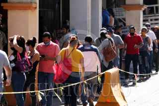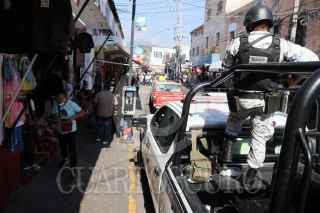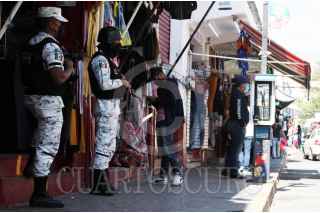 CUERNAVACA, MORELOS, 05ENERO2021.- Elementos policiacos y de la Guardia Nacional vigilan la calle Clavijero en el centro de la ciudad para evitar que comerciantes informales se instalen a vender juguetes. Cientos de padres se forman en largas colas para ingresar a tiendas departamentales para comprar los regalos de mañana. FOTO: MARGARITO PÉREZ RETANA/CUARTOSCURO.COM