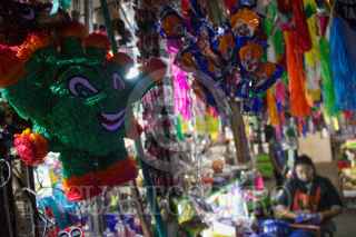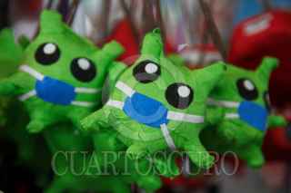 CIUDAD DE MÉXICO, 05ENERO2021.- Artesanos de piñatas que venden en el mercado Jamaica han optado por ampliar su muestrario agregando de Covid-19. De todos tamaños pueden verse en los puestos coloridos característicos del lugar. FOTO: ANDREA MURCIA /CUARTOSCURO.COM