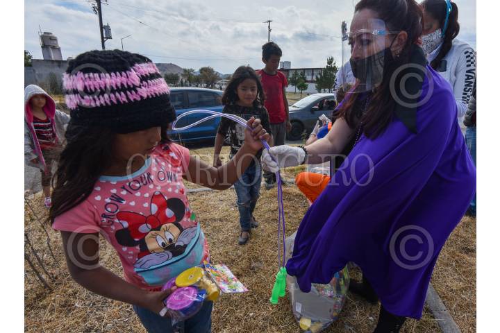 TOLUCA, ESTADO DE MÉXICO, 06ENERO2021.- Integrantes del Movimiento Operación Hormiga A. C. Toluca llevaron alegría a niños de escasos recursos en este Día de Reyes, de colonias como Paseos de San Martín, obsequiándoles juguetes y disfrazados de algunos personajes animados; manteniendo la sana distancia y utilizando gel antibacterial los niños guardaron las medidas higiénicas ante la contingencia por COVID-19. FOTO: CRISANTA ESPINOSA AGUILAR /CUARTOSCURO.COM