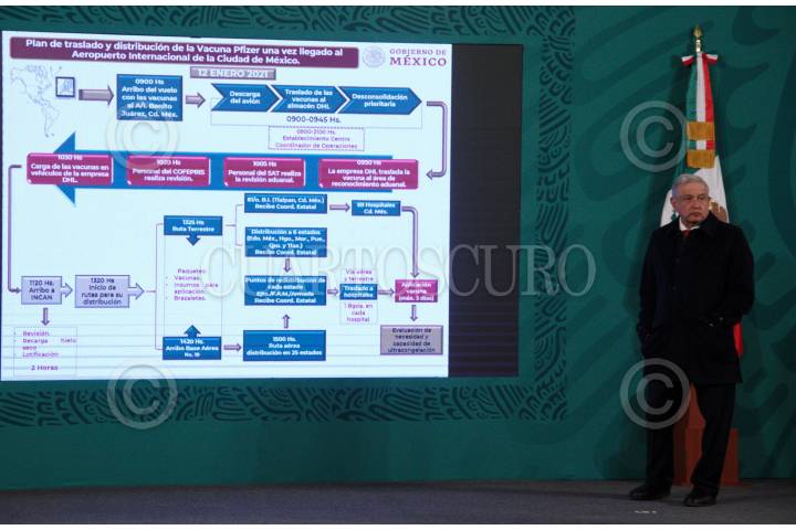 CIUDAD DE MÉXICO, 12ENERO2021.- Andrés Manuel López Obrador, presidente de México acompañado de Hugo López-Gatell Ramírez, subsecretario de Prevención y Promoción de la Salud; Zoé Robledo Aburto, director general del IMSS; Luis Cresencio Sandoval González, secretario de la Defensa Nacional (SEDENA) y José Rafael Ojeda Durán, secretario de la Marina, durante la conferencia de prensa matutina en Palacio Nacional donde se destacó el tema y logistica de la llegada de las 400,000 mil vacunas contra COVID-19. FOTO: ANDREA MURCIA / CUARTOSCURO.COM