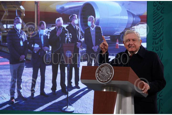 CIUDAD DE MÉXICO, 12ENERO2021.- Andrés Manuel López Obrador, presidente de México acompañado de Hugo López-Gatell Ramírez, subsecretario de Prevención y Promoción de la Salud; Zoé Robledo Aburto, director general del IMSS; Luis Cresencio Sandoval González, secretario de la Defensa Nacional (SEDENA) y José Rafael Ojeda Durán, secretario de la Marina, durante la conferencia de prensa matutina en Palacio Nacional donde se destacó el tema y logistica de la llegada de las 400,000 mil vacunas contra COVID-19. FOTO: ANDREA MURCIA / CUARTOSCURO.COM