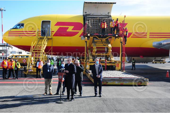 CIUDAD DE MÉXICO, 12ENERO2021.- Esta mañana aterrizó en el Aeropuerto Internacional de la Ciudad de México (AICM) el cargamento de 439 dosis de vacunas contra el Covid-19, con más cuales se busca terminar la primera etapa de inmunización en el personal médico que enfrenta este virus en los hospitales y posteriormente atender al sector de la tercera edad. Los encargados de recibir el cargamento de las vacunas de Pfizer, fueron el canciller, Marcelo Ebrard el secretario de Salud, Jorge Alcocer, el titular de Hacienda, Arturo Herrera y el encargado del Insabi, Juan Ferrer. FOTO: DANIEL AUGUSTO /CUARTOSCURO.COM