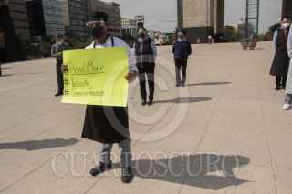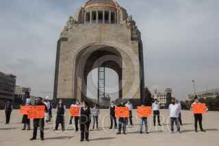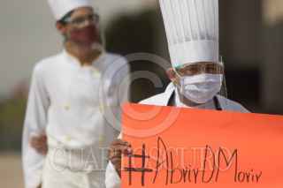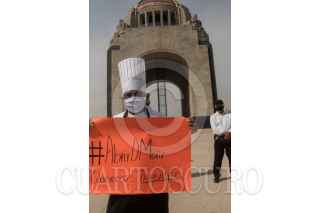 CIUDAD DE MÉXICO, 14ENERO2021.- Trabajadores de restaurantes de las inmediaciones del Monumento a la Revolución se manifestaron en agradecimiento a que se les permita reabrir el próximo lunes. Tras las reuniones de negociación entre autoridades capitalinas y la industria de alimentos y servicios, se acordó la reapertura el próximo lunes 18 de enero con medidas más estrictas, entre las que se encuentran, la operación de 8 de la mañana a 6 de la tarde, distancia entre mesa y mesa de 1.5 metros y priorizar ocupación en terrazas y al aire libre. FOTO: VICTORIA VALTIERRA/CUARTOSCURO.COM