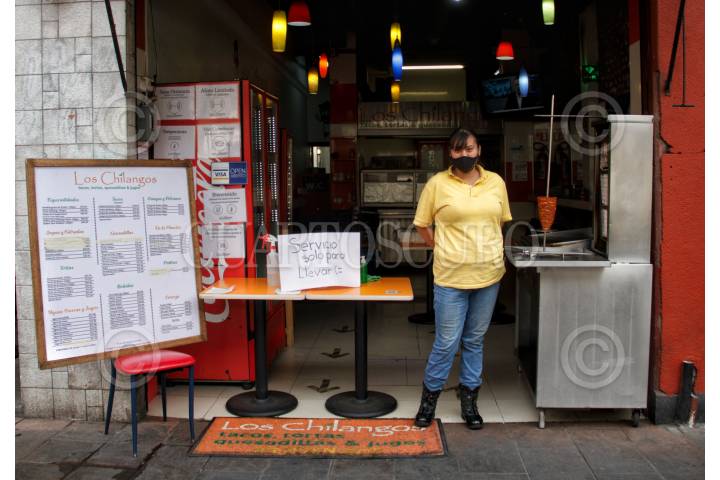 CIUDAD DE MÉXICO, 14ENERO2021.- Restauranteros de grandes y pequeños negocios del Centro Histórico esperan la llegada de clientes ante el "semáforo rojo" que conlleva el cierre de calles principales, así como la restricción a solo servicio para llevar. Esto a provocado que se encuentren a punto de cerrar por la falta de ventas, según los empleados. FOTO: ANDREA MURCIA /CUARTOSCURO.COM