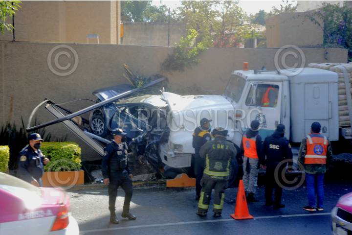 Ciudad de México, 15 enero 2021. Una mujer se libro de perder la vida, al quedar entre los fierros aplastados de un auto se servicio público, que fue aplastado por un camión que se quedó sin frenos en la bajada de Picacho Ajusco a la altura de calle Pico de Turquino en la colonia Jardines de la Montaña, en alcaldía de Tlalpan. Foto : Luis Carbayo/cuartoscuro.com