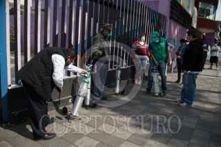CIUDAD DE MÉXICO, 15ENERO2021.- Familiares de personas con COVID-19 positivo atendidas en casa acuden desde temprana hora al TRIAGE COVID-19 de la delegación Gustavo A. Madero (GAM) para llenar de manera gratuita sus tanques de oxígeno. Este apoyo se realiza en conjunto con el Gobierno de la Ciudad y la alcaldía GAM. FOTO: ANDREA MURCIA /CUARTOSCURO.COM