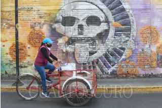 CIUDAD DE MÉXICO, 16ENERO2021.- La alcaldia Iztapalapa es una de las demarcaciones con más altos índices de contagios, lo que ha obligado a las autoridades a implementar de manera más eficaz y contante los programas para que los vecinos respeten las normas sanitarias. En imagen una mujer recorre la periferia de la Plaza Cívica de Iztapalapa en su triciclo, frente a mural alusivo al Dios del Inframundo en la cultura Mexica. FOTO: ROGELIO MORALES /CUARTOSCURO.COM