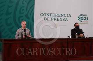 CIUDAD DE MÉXICO, 16ENERO2021. - Hugo López-Gatell Ramírez, subsecretario de Prevención y Promoción de la Salud y José Luis Alomía Zegarra, director general de epidemiología durante el informe diario de COVID-19, donde se informó sobre el avance d el jornada de vacunación contra el virus. FOTO: ANDREA MURCIA /CUARTOSCURO.COM