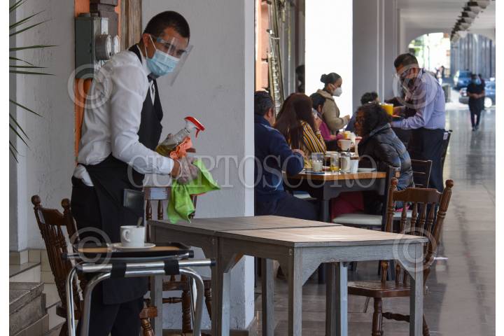 TOLUCA, ESTADO DE MÉXICO, 18ENERO2021.- Este lunes los restaurantes abrieron sus puertas y pudieron recibir comensales en mesas instaladas en espacios abiertos como parte de las medidas durante el semáforo rojo por la contingencia de COVID-19, después de haber llevado a cabo cacerolazos pidiendo poder abrir ante la situación económica que enfrentan. FOTO: CRISANTA ESPINOSA AGUILAR /CUARTOSCURO.COM