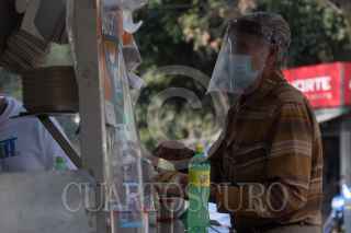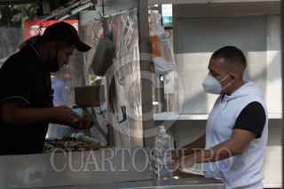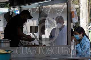 CIUDAD DE MÉXICO, 18ENERO2021.- Un puesto de tacos de guisado atiende un pedido en la alcaldía Benito Juárez. FOTO: MOISÉS PABLO/CUARTOSCURO.COM