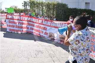 CHILPANCINGO, GUERRERO, 18ENERO2021.- Trabajadores eventuales de la Secretaría de Salud Guerrero protestaron esta mañana debido al rompimiento en la mesa de negociación agendada con representantes de la dependencia estatal. Alrededor de las 9:30 horas, más de 50 trabajadores por contrato de la Secretaría se concentraron al exterior del hotel Holiday Inn en donde tendrían una reunión con autoridades de salud, en la que expondrían los diversos puntos planteados en el pliego petitorio. Los trabajadores denunciaron que Maricarmen López Olivares, subsecretaria de finanzas de la Secretaría de Salud, quien acudió a la reunión en representación del titular de dicha dependencia, Carlos de la Peña Pintos, “rompió” la mesa de negociación tras no llegar acuerdos, por lo decidieron protestar nuevamente. De acuerdo con los manifestantes, la funcionaria se levantó de la mesa tras explicarles que no había techo presupuestal para la recontratación del personal de salud y no hubo punto de mediación, puesto que los inconformes exigían ser incorporados al sector salud. FOTO: DASSAEV TÉLLEZ ADAME/CUARTOSCURO.COM