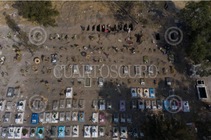 CIUDAD DE MÉXICO, 19ENERO2021.- Debido a la saturación de casos para enterrar cuerpos de muertes a causa de Covid-19, el "Área Covid" en el Panteón San Lorenzo ha sido ampliada con 40 fosas al extremo del espacio designado. Cada diez minutos ingresan de 6 a 8 carrozas para el servicio de inhumación, en el que sólo se permite la entrada a dos familiares con un periodo de veinte minutos, dependiendo la fila de espera. En el Panteón San Nicolás Tolentino también han comenzado a excavar fosas que ya no están en uno para las inhumaciones de casos Covid, el horario de atención es de 8 a 15 horas con un promedio de 20 carrozas aproximadamente al día. En México se registraron 8,074 nuevos casos y 544 muertes en las últimas 24 horas,con un total de 1,649,502 casos confirmados acumulados y 141,248 muertes. FOTO: GRACIELA LÓPEZ /CUARTOSCURO.COM