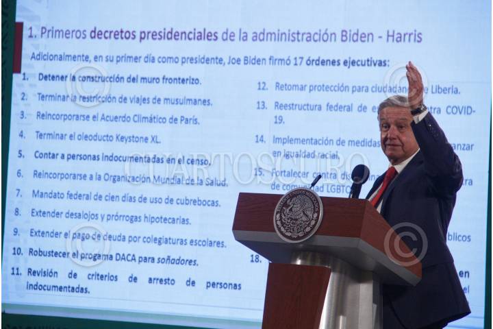 CIUDAD DE MÉXICO, 21ENERO2021.- Andrés Manuel López Obrador, presidente de México, durante la conferencia matutina que se lleva a cabo en Palacio Nacional. El mandatario destacó el tema de la llegada de Biden a la presidencia de los Estados Unidos; declaró que no hay enemistades hasta ahora y espera que sean países vecinos cercanos y no lejanos. FOTO: ANDREA MURCIA /CUARTOSCURO.COM