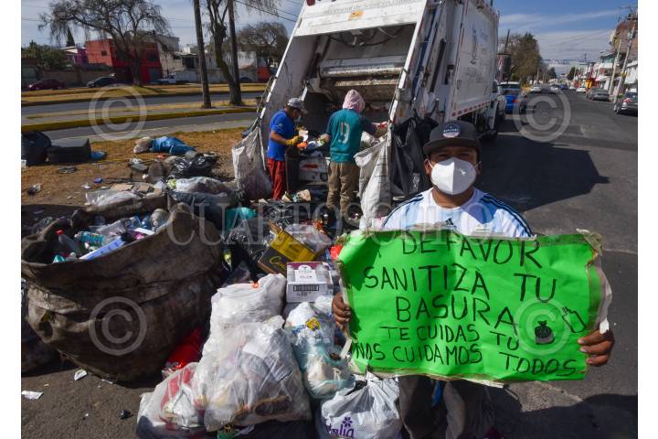 TOLUCA, ESTADO DE MÉXICO, 24ENERO2021.- Camiones recolectores de basura de Toluca portan pancartas y lonas en donde piden a la población saniticen sus desechos y les informen si los residuos son de enfermos por COVID-19, para que puedan darle un trato diferente y evitar cualquier contagios. FOTO: CRISANTA ESPINOSA AGUILAR /CUARTOSCURO.COM