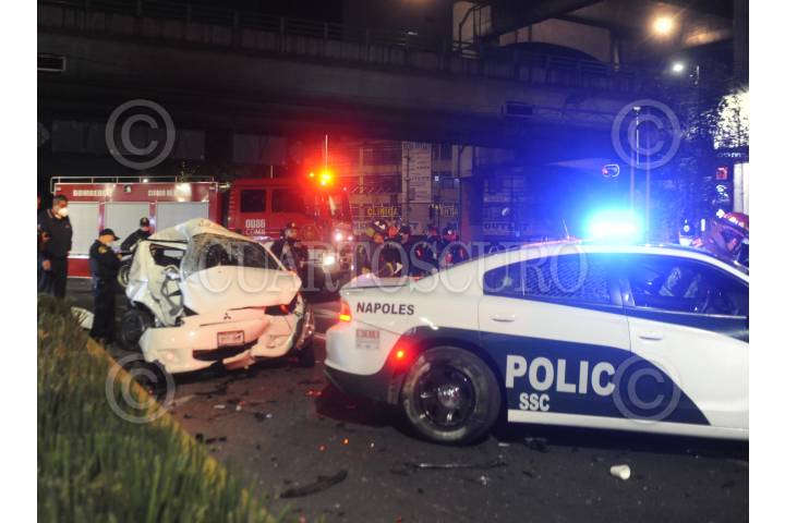 Ciudad de México, 25 enero 2021. Muere un hombre de la tercera edad a bordo de un auto compacto, tras ser impactado por un auto Seat León en el cruce de avenida Revolución y San Antonio de la colonia Nonoalco, en donde también se vieron afectadas una patrulla del sector Napoles y una camioneta Pick Up. El conductor fue detenido por su presunta responsabilidad en este accidente. Foto : Luis Carbayo/cuartoscuro.com
