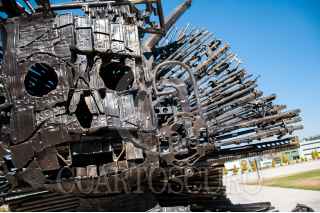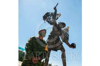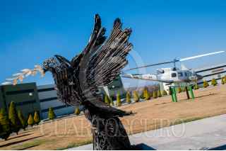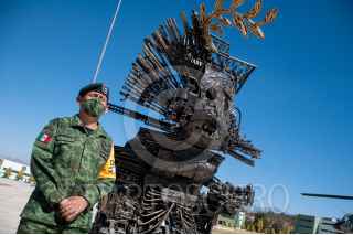 TEMAMATLA, ESTADO DE MÉXICO.- Como parte de las celebraciones del 30 aniversario de la creación de las Fuerzas Especiales del Ejército y Fuerza Aérea Mexicana se lanzó una convocatoria para la creación de esculturas a partir del decomiso de armas al crimen organizado y con este material elaborar las obras que fueron colocadas en la explanada del Cuartel General de las Fuerzas Especiales en el Municipio de Temamatla, en el Estado de México. Las piezas "Dualismo", "Monumento a la Victoria" y "Día" y "Noche" se encuentran expuestas desde el pasado primero de agosto. FOTO: DANIEL AUGUSTO /CUATOSCURO.COM