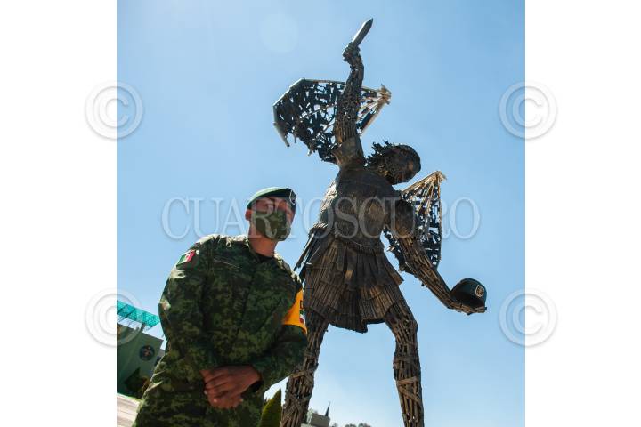 TEMAMATLA, ESTADO DE MÉXICO.- Como parte de las celebraciones del 30 aniversario de la creación de las Fuerzas Especiales del Ejército y Fuerza Aérea Mexicana se lanzó una convocatoria para la creación de esculturas a partir del decomiso de armas al crimen organizado y con este material elaborar las obras que fueron colocadas en la explanada del Cuartel General de las Fuerzas Especiales en el Municipio de Temamatla, en el Estado de México. Las piezas "Dualismo", "Monumento a la Victoria" y "Día" y "Noche" se encuentran expuestas desde el pasado primero de agosto. FOTO: DANIEL AUGUSTO /CUATOSCURO.COM