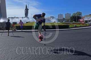 GUADALAJARA, JALISCO, 25ENERO2021.- Roger, Miguel, Chava y Pollas son jóvenes procedentes de la Ciudad de México y desde hace ya 6 años se dedican a dominar el balón en los cruceros de las ciudades del País, el día de hoy se les observo haciendo sus fantasías de freestyle en los alrededores de la Glorieta Minerva y comentan que en esta época de pandemia sanitaria por Covid-19, es mas complicado ganarse unos pesos ya que la gente esta pasando por una crisis económica. FOTO: FERNANDO CARRANZA GARCIA / CUARTOSCURO.COM