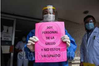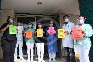 CAMPECHE, CAMPECHE, 25ENERO2021.- Personal de salud de la Unidad de Medicina Familiar no.10 del IMSS en Campeche, protestaron porque aún no reciben la vacuna anticovid, dijeron estar en la incertidumbre porque aún no les han dado día, ni fecha para ser vacunados, en representación de al menos más de 100 trabajadores comentaron al respecto de la vacunación de los docentes, lo cual dijeron no estar en contra, pero afirmaron que existen personal de salud que está laborando y teniendo contacto con personas enfermas de Covid-19 y aún no han sido vacunados. FOTO: MICHAEL BALAM/CUARTOSCURO.COM