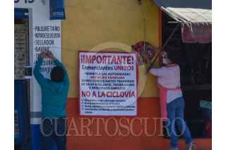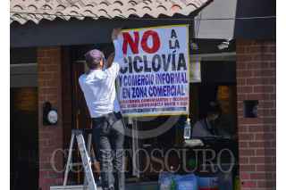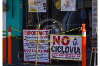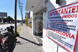 TOLUCA, ESTADO DE MÉXICO, 26ENERO2021.- Comerciantes y vecinos de la avenida Isidro Fabela en Toluca piden que autoridades estales y municipales reubiquen la ciclovía que fue pintada en esta vialidad tan transitada, la cual carece de señalamientos; los comerciantes se dicen afectados en primera instancia por la pandemia por COVID-19 y ahora por no poder realizar trabajos de carga o descarga, o que sus clientes puedan estacionarse en esta zona, por ello colocaron algunas mantas en donde piden los dejen trabajar. Comentan no estar en contra de la ciclovía pero que se busquen opciones que que no se vean más afectados. FOTO: CRISANTA ESPINOSA AGUILAR /CUARTOSCURO.COM