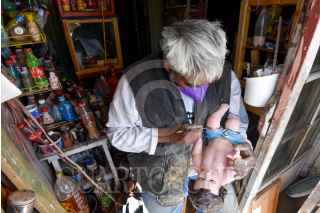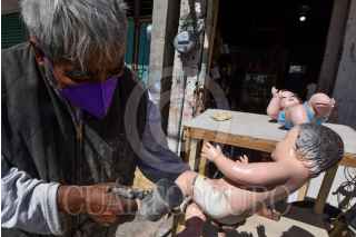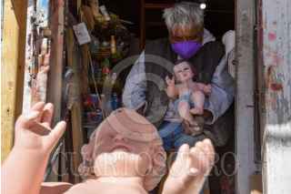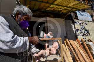 OTZOLOTEPEC, ESTADO DE MÉXICO, 26ENERO2021.- El señor Issac Cortázar conocido como “Don Chavelo” y originario del municipio de Otzolotepec lleva más de 40 años dedicándose a la reparación de imágenes del Niño Dios, aprendió de su padre y su abuelo; en un pequeño local tiene el Hospital del Niño Dios en donde repara las figuras religiosas, durante la pandemia por COVID-19 el trabajo ha bajado considerablemente y solo llegan los clientes de muchos años. Antes de iniciar el trabajo de reparación sanitiza cada imagen para evitar cualquier contagio, posteriormente realiza la reparación, la cual le pagan con dinero o en la mayoría de cosas con algún producto de despensa, realizando un truque, considerando que muchas personas han perdido su trabajo y buscan continuar con el festejo del Día de la Candelaria. FOTO: CRISANTA ESPINOSA AGUILAR /CUARTOSCURO.COM