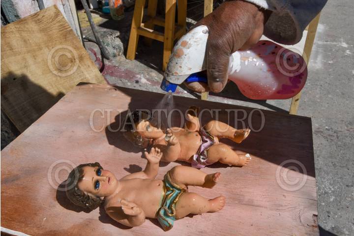 OTZOLOTEPEC, ESTADO DE MÉXICO, 26ENERO2021.- El señor Issac Cortázar conocido como “Don Chavelo” y originario del municipio de Otzolotepec lleva más de 40 años dedicándose a la reparación de imágenes del Niño Dios, aprendió de su padre y su abuelo; en un pequeño local tiene el Hospital del Niño Dios en donde repara las figuras religiosas, durante la pandemia por COVID-19 el trabajo ha bajado considerablemente y solo llegan los clientes de muchos años. Antes de iniciar el trabajo de reparación sanitiza cada imagen para evitar cualquier contagio, posteriormente realiza la reparación, la cual le pagan con dinero o en la mayoría de cosas con algún producto de despensa, realizando un truque, considerando que muchas personas han perdido su trabajo y buscan continuar con el festejo del Día de la Candelaria. FOTO: CRISANTA ESPINOSA AGUILAR /CUARTOSCURO.COM