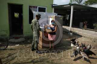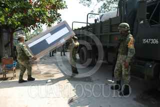 NACAJUCA, TABASCO, 27ENERO2021.- Elementos del Ejército Mexicano entregan enseres domésticos a pobladores que resultaron afectados por inundaciones por desbordes de los ríos Carrizal y Samaria. En esta zona indígena Chontal, Mazateupa, fue de las mayor afectadas, además de ser una zona de arte autóctono de tiras bordadas, sombreros y mimbre, también hubo pérdida en ganadería y campo de cultivo. FOTO: CARLOS CABAL OBRADOR/CUARTOSCURO.COM