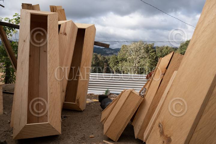 SAN JUAN CHAMULA, CHIAPAS, 31ENERO2021.- La fabrica de ataúdes Rosales lleva más de tres generaciones trabajando en la construcción de ataúdes de madera desde 900 pesos hasta más de 20 mil. Ellos producen ataúdes para la gente de la comunidad de San Juan Chamula y para algunas funerarias de San Cristóbal de las Casas, Tuxtla Gutiérrez, Comitán, San Andrés Larráinzar entre otras. Comenta José Rosales dueño de la fábrica que su padre le enseñó el oficio y el asu vez se lo mostró a su hijo William quien atiende el negocio y también fabrica ataúdes junto con su amigo de infancia Daniel, son encargados de la fabricación principalmente, cuando el trabajo aumenta contratan a más ayudantes, mencionaron que a raíz de la pandemia por Covid 19, la venta en la ciudades grandes del estado aumentaron considerablemente. FOTO: ISABEL MATEOS /CUARTOSCURO.COM