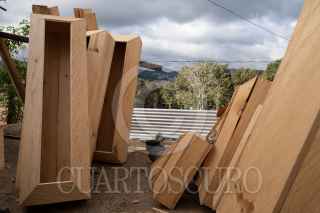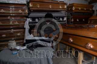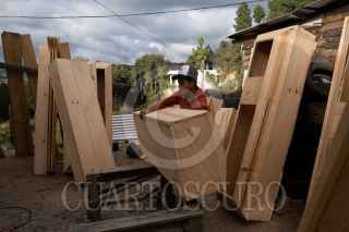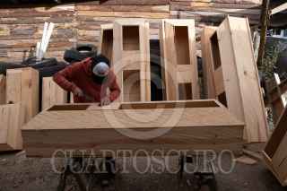 SAN JUAN CHAMULA, CHIAPAS, 31ENERO2021.- La fabrica de ataúdes Rosales lleva más de tres generaciones trabajando en la construcción de ataúdes de madera desde 900 pesos hasta más de 20 mil. Ellos producen ataúdes para la gente de la comunidad de San Juan Chamula y para algunas funerarias de San Cristóbal de las Casas, Tuxtla Gutiérrez, Comitán, San Andrés Larráinzar entre otras. Comenta José Rosales dueño de la fábrica que su padre le enseñó el oficio y el asu vez se lo mostró a su hijo William quien atiende el negocio y también fabrica ataúdes junto con su amigo de infancia Daniel, son encargados de la fabricación principalmente, cuando el trabajo aumenta contratan a más ayudantes, mencionaron que a raíz de la pandemia por Covid 19, la venta en la ciudades grandes del estado aumentaron considerablemente. FOTO: ISABEL MATEOS /CUARTOSCURO.COM