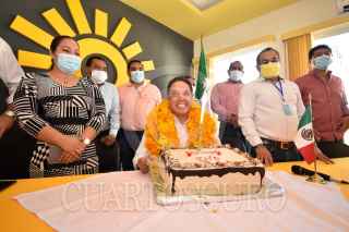 CHILPANCINGO, GUERRERO, 01FEBRERO2021.- "Puedo ganar la encuesta, estoy convencido que hemos hecho todo lo necesario, me siento listo, me siento fuerte, me siento bien, vamos a ganar y vamos a encabezar esta alianza con mucha humildad frente al pueblo de Guerrero", aseguró Evodio Velázquez Aguirre a 4 días de arrancar la encuesta que definirá al representante de la alianza PRD - PRI rumbo al gobierno de Guerrero. Durante una conferencia de prensa en las oficinas del PRD estatal, el aspirante del sol azteca puntualizó que han hecho una labor de unidad, "una unidad real que tiene hoy el PRD con todos sus grupos; además somos prioridad para el PRD nacional y estaremos en el cuidado y la observancia para que todo se lleve con gran transparencia, no estamos apostando a que se manche este proceso que hemos cuidado con nuestros aliados del PRI y por eso creemos que vamos a llegar muy bien al fin de semana, para que se levanten las encuestas pertinentes y el próximo 10 de febrero ya tengamos candidato de la alianza". Al finalizar la conferencia de prensa, los representantes del PRD celebraron el cumpleaños número 43 del ex alcalde de Acapulco y aspirante a la candidatura a Gobernador por la coalición PRI-PRD en Guerrero. FOTO: DASSAEV TÉLLEZ ADAME/CUARTOSCURO.COM