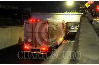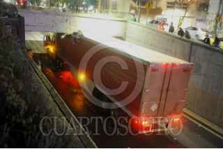 Ciudad de México, 02 febrero 2021. Un trailer que circulaba en carriles centrales de Viaducto quedó atorado bajo el puente de avenida Medellín en la colonia Piedad Narvarte, en alcaldía de Benito Juárez. Foto :Luis Carbayo/cuartoscuro.com