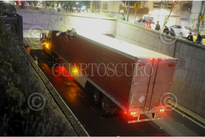Ciudad de México, 02 febrero 2021. Un trailer que circulaba en carriles centrales de Viaducto quedó atorado bajo el puente de avenida Medellín en la colonia Piedad Narvarte, en alcaldía de Benito Juárez. Foto :Luis Carbayo/cuartoscuro.com