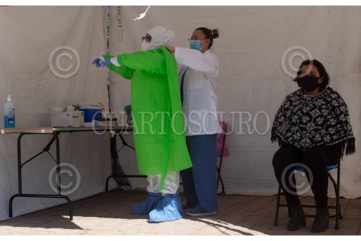CIUDAD DE MÉXICO, 03FEBRERO2021.- Personal de Salud realiza pruebas rápidas de Covid-19 a mujeres embarazadas que presenten síntomas desde el pasado 27 de enero en la explanada de la alcaldía Xochimilco. Los resultados tardan aproximadamente 15 minutos en entregarse, si el resultado de la paciente resulta negativo pero presenta síntomas se le realiza la prueba PCR y en un periodo de 6 a 7 recibe su resultado vía telefónica, el único requisito que debe presentar es una identificación oficial en un horario de 9 a 14 horas. FOTO: GRACIELA LÓPEZ /CUARTOSCURO.COM