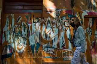 CIUDAD DE MÉXICO, 04FEBRERO2021.- Una mujer con cubrebocas camina frente al mural en honor a los médicos que el pintor Gabriel Macotela realizo en la facha de su estudio, en las calles de San Luis Potosí al cruce con Jalapa en la colonia Roma. FOTO: GALO CAÑAS/CUARTOSCURO.COM