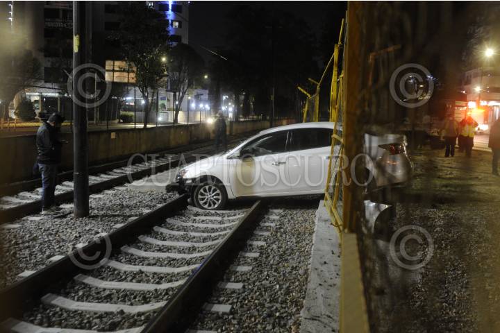 CIUDAD DE MÉXICO, 08FEBRERO2021.- Un automóvil terminó dentro de las vías del Tren Ligero, su conductor iba a exceso de velocidad lo que provocó que perdiera el control de la unidad. Al parecer estaba jugando arrancones sobre avenida Tlalpan, a la altura de calle 4, en la colonia Espartaco, alcaldía de Coyoacán. FOTO: LUIS CARBAYO/CUARTOSCURO.COM