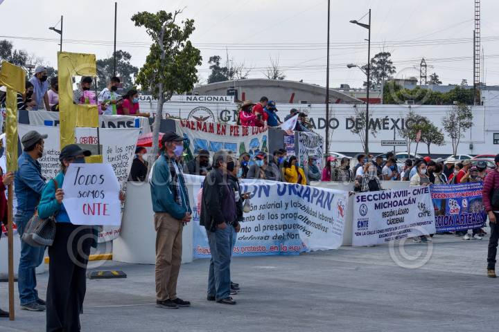 TOLUCA, ESTADO DE MÉXICO, 09FEBRERO2021.- Maestros integrantes de la Coordinadora Nacional de Trabajadores de la Educación (CNTE) de la Sección XVIII de Michoacán y XVI y XLII de Jalisco en su paso por la ciudad de Toluca como parte de la Caravana por la Estabilidad Laboral y Salarial que tiene como destino la CDMX; realizaron una concentración en la explanada de las Torres Bicentenario en donde exigieron estabilidad salarial, pago de sueldos entre otras cosas mientras una comisión sostenía una reunión con autoridades educativas. FOTO: CRISANTA ESPINOSA AGUILAR /CUARTOSCURO.COM