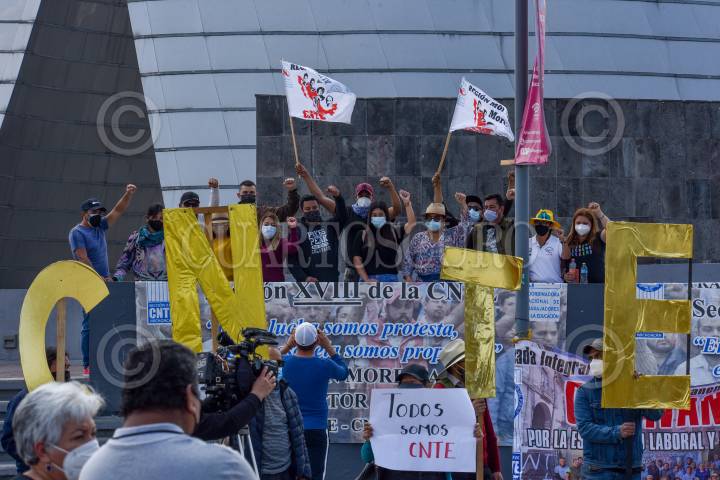 TOLUCA, ESTADO DE MÉXICO, 09FEBRERO2021.- Maestros integrantes de la Coordinadora Nacional de Trabajadores de la Educación (CNTE) de la Sección XVIII de Michoacán y XVI y XLII de Jalisco en su paso por la ciudad de Toluca como parte de la Caravana por la Estabilidad Laboral y Salarial que tiene como destino la CDMX; realizaron una concentración en la explanada de las Torres Bicentenario en donde exigieron estabilidad salarial, pago de sueldos entre otras cosas mientras una comisión sostenía una reunión con autoridades educativas. FOTO: CRISANTA ESPINOSA AGUILAR /CUARTOSCURO.COM