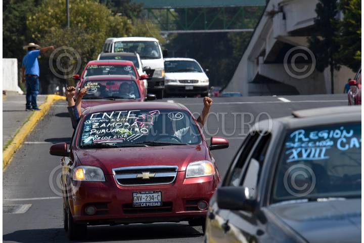 TOLUCA, ESTADO DE MÉXICO, 09FEBRERO2021.- Maestros integrantes de la Coordinadora Nacional de Trabajadores de la Educación (CNTE) de la Sección XVIII de Michoacán y XVI y XLII de Jalisco en su paso por la ciudad de Toluca como parte de la Caravana por la Estabilidad Laboral y Salarial que tiene como destino la CDMX; realizaron una concentración en la explanada de las Torres Bicentenario en donde exigieron estabilidad salarial, pago de sueldos entre otras cosas mientras una comisión sostenía una reunión con autoridades educativas. FOTO: CRISANTA ESPINOSA AGUILAR /CUARTOSCURO.COM