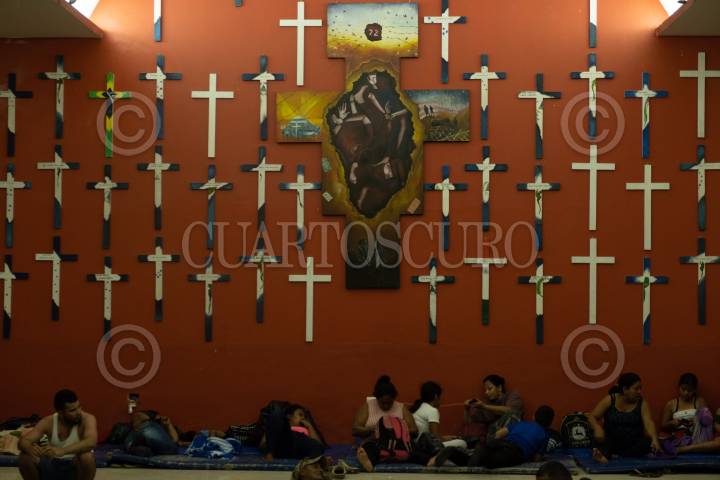 TENOSIQUE, TABASCO, 09FEBRERO2021.- Migrantes en su mayoría Hondureños permanecen en las inmediaciones del albergue La 72 mientras esperan iniciar trámites migratorios o continuar con su objetivo de llegar a Estados Unidos. Las tormentas Iota y Eta ocasionaron que miles de hondureños quedaran en situación de calle ya que sus casas se inundaron o quedaron sepultadas en el lodo, lo cual los obligó más allá de la violencia y falta de trabajo en el país a migrar para buscar oportunidades de vivir mejor. Durante la noche algunos de los migrantes son recibidos en el albergue para pasar la noche y cenar. Los migrantes son alojados en un salón de usos múltiples el cual en una de sus paredes alberga un mural en homenaje a los migrantes masacrados en San Fernando hace más de diez años, donde perdieron la vida 193 personas provenientes de diferentes países. FOTO: ISABEL MATEOS /CUARTOSCURO.COM