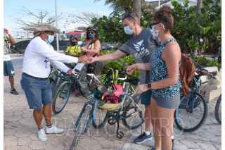 PUERTO MORELOS, QUINTANA ROO 12FEBRERO2021.- Puerto Morelos es municipio con el menor número de casos confirmados de Covid-19 en el Estado, y uno con los menores índices a nivel nacional que esta mañana, empleados de la Zona Federal Marítimo Terrestre (Zofemat), adscritos al programa Blue Flag, atendieron a grupos de turistas que realizaban paseos en bicicleta en el Casco Antiguo, como parte de las actividades que prestadores de servicios les ofrecen en este destino, ofreciéndoles gel antibacterial y cubrebocas. FOTO: ELIZABETH RUIZ /CUARTOSCURO.COM