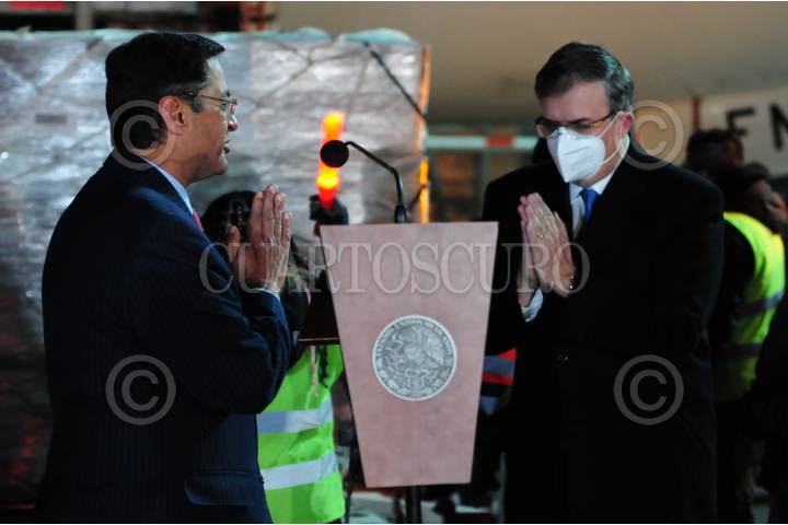 CIUDAD DE MÉXICO, 14FEBRERO2021.- La madrugada de este domingo arribaron 870 mil dosis de la vacuna contra el Covid-19 elaboradas por la farmacéutica AstraZeneca. La aeronave Boeing 777 llegado desde la India fue recibido por el Canciller Marcelo Ebrard, que estuvo acompañado por el titular del IMSS, Zoé Robledo, el embajador de la India en México, Manpreet Vohra y la directora de Astra Zeneca en México, Sylvia Varela. FOTO: DANIEL AUGUSTO /CUARTOSCURO.COM