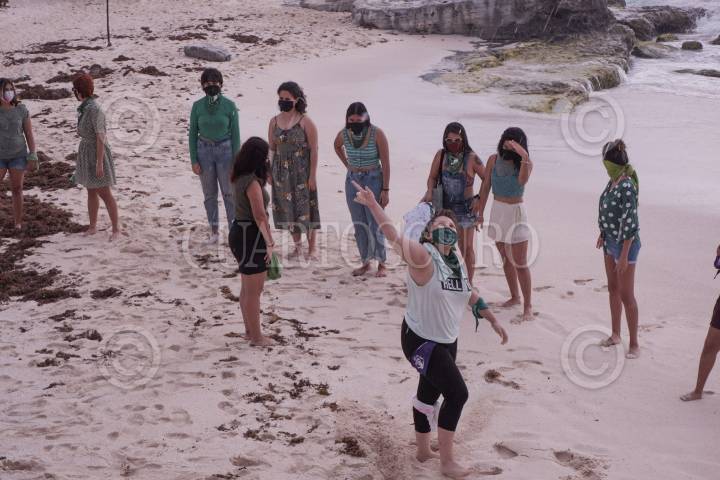 CANCÚN, QUINTANA ROO, 14FEBRERO2021.- Mujeres de colectivas feministas realizaron un "pañuelazo" playero en la playa gaviota de este destino turístico, con el fin de exigir que el aborto legal, seguro y gratuito se logre en todo el país. FOTO: ELIZABETH RUIZ /CUARTOSCURO.COM